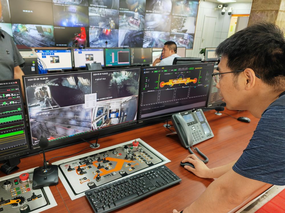 在山西省霍州市的山西焦煤集團(tuán)李雅莊煤礦,綜采隊技術(shù)員在井上控制井下割煤機(2024年5月29日攝)。新華社記者 王勁玉 攝