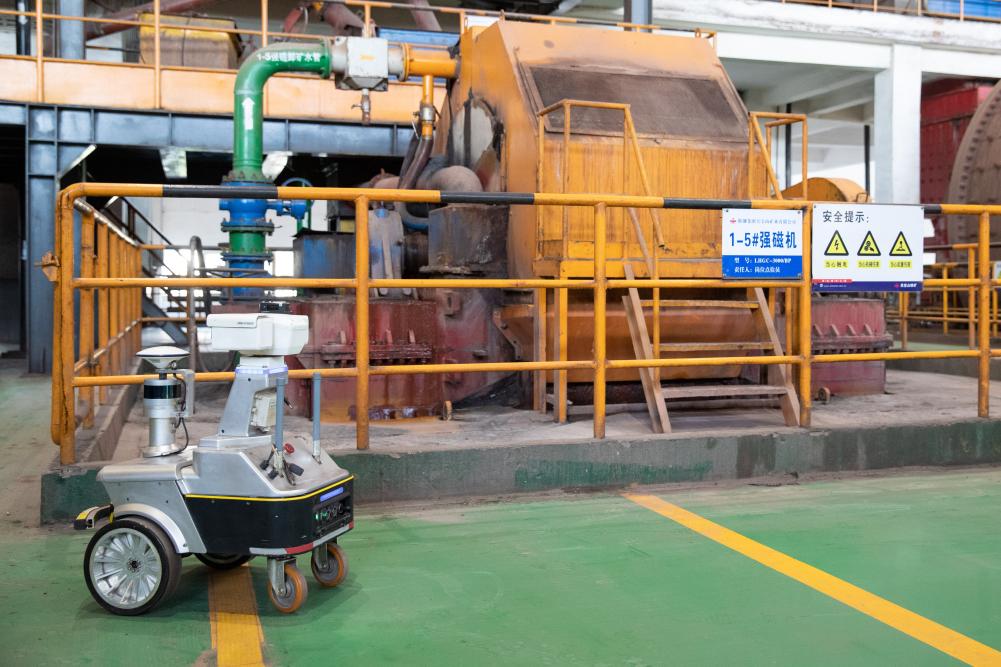 生產(chǎn)現(xiàn)場(chǎng)無(wú)人化,依靠什么來(lái)實(shí)現(xiàn)?步入磨磁車間,巨大的轟鳴聲在這個(gè)長(zhǎng)約100米、寬約50米、高約30米的廠房?jī)?nèi)回響。登上二樓作業(yè)平臺(tái),兩臺(tái)直徑6.2米的大型球磨機(jī)上的轉(zhuǎn)輪正在飛速旋轉(zhuǎn)。不遠(yuǎn)處,磨磁巡檢機(jī)器人閃爍著燈光,正在采集設(shè)備溫度、振動(dòng)等狀態(tài)數(shù)據(jù)。