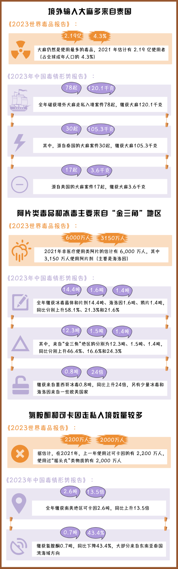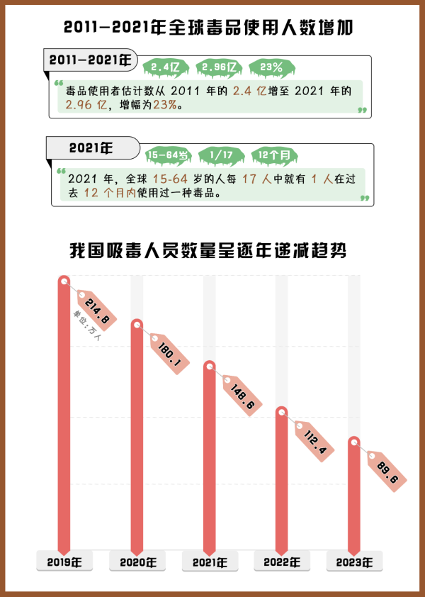 (制作:法治網(wǎng)輿情中心 數(shù)據(jù)來(lái)源:《2023年世界毒品報(bào)告》《2023年中國(guó)毒情形勢(shì)報(bào)告》)