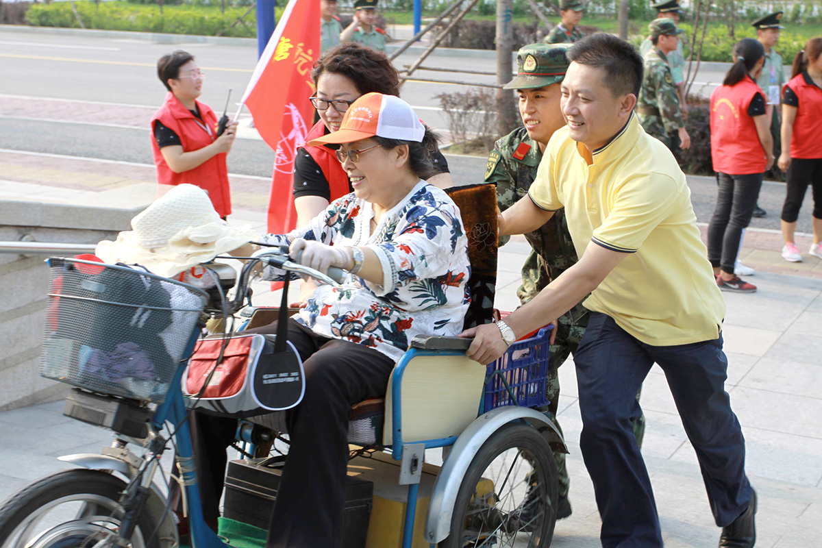楊震生(右一)和志愿者帶唐山大地震截癱傷員游覽公園。