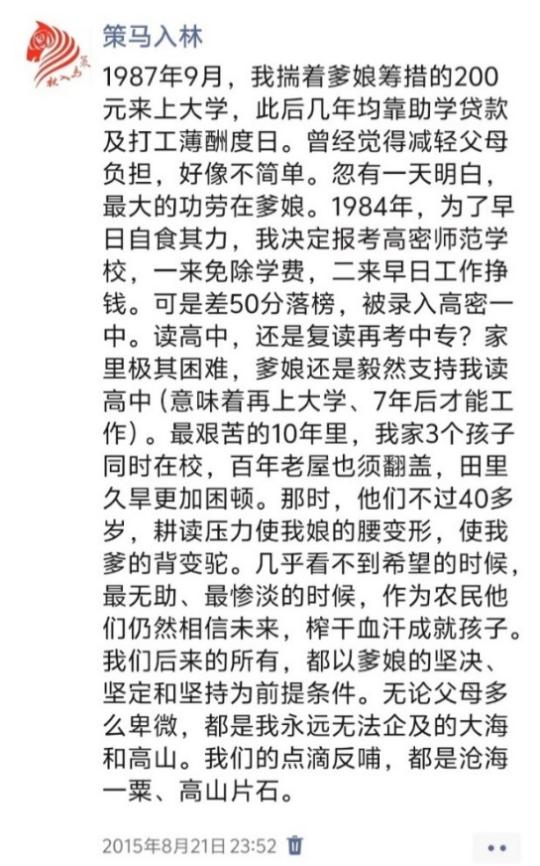 2015年8月21日微信朋友圈帖文,此帖點(diǎn)贊評(píng)論互動(dòng)量500多次。