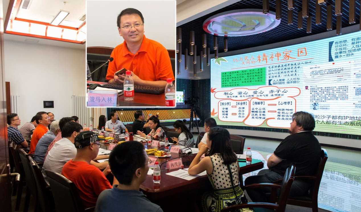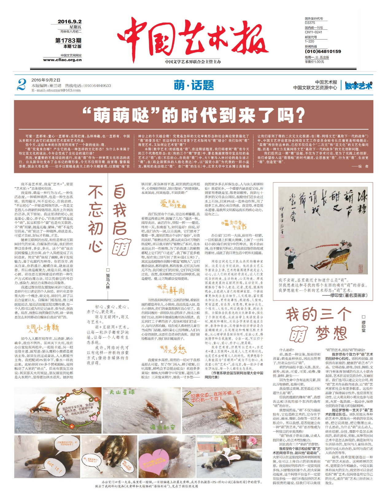 2016年8月6日,參加中國文聯(lián)文藝資源中心主題為“藝術的賣萌”的第二期藝術沙龍,發(fā)言并撰文《不忘初心 自我啟萌》,刊于9月2日《中國藝術報》。文章提出:我覺得,“萌”是一種行為方式,一種生活態(tài)度,一種精神境界,也是一種生態(tài)系統(tǒng)。我這里講的初心,就是童心、愛心、赤子心?!白晕覇⒚取本褪沁@個“萌”,其實和那個“蒙”也是有關聯(lián)的,不“萌”而蒙,就是無趣、蒙昧?!懊取辈皇菓{空而來,“萌”到達了一種境界,萌就是美,可愛才美麗,好玩才有趣、才美。隨著互聯(lián)網(wǎng)的出現(xiàn),特別是移動互聯(lián)網(wǎng)時代的到來、自媒體的興起,我們的世界日益多樣、多變、多元。這個“萌”就由民間慢慢上到臺面,由個人風格變成了共同追求。其實“萌”體現(xiàn)了幽默,善于發(fā)現(xiàn)魅力,善于化腐朽為神奇。你若芬芳、清風自來,你若盛開、蝴蝶自來。所以萌是凝聚力,萌是共識,萌是同心圓。萌也是互聯(lián)網(wǎng)建設治理的一種生產(chǎn)方式和治理方法,可以憑借它的號召力、感染力、到達力來推動公共服務??倳浽谖乃嚬ぷ髯剷现赋?,藝術的最高境界就是讓人動心,讓人們的靈魂經(jīng)受洗禮,讓人們發(fā)現(xiàn)自然的美、生活的美、心靈的美。拜我國高速發(fā)展的互聯(lián)網(wǎng)所賜,互動空間、自媒體給了每個人表達、記錄、發(fā)現(xiàn)、提高的機會,正在進入自己的精神家園。個體敘事更加關注生活細節(jié)、人文現(xiàn)場,富有露水和淚水,更有故事性、現(xiàn)場感、人情味, 更有溫度、有品質、有思想,更加分眾化、個性化、人性化,所以感染力強、到達力強。自媒體全民表達的文化新革命,強化了個體權利感,就是分權、賦權和確權,就是追求自律、自凈和自洽,就是凸顯蝴蝶效應、長尾理論和喚醒沉默大多數(shù),就是傾訴傾聽、安放心靈、釋放情懷和自我救贖。合在一起,可以歸于初心、童心、愛心、赤子心,就是萌。我非藝術家,但我可以“藝術+”,當“藝術+”遇上“互聯(lián)網(wǎng)+”,這便是人人藝術的時代,也是藝術去哺育人人的時代。我夢想每個人都能因為“互聯(lián)網(wǎng)+”成為不忘初心、未泯童心的“藝術+”,在這里,每一粒沙子都有IP地址,每一個人都有生態(tài)系統(tǒng)。