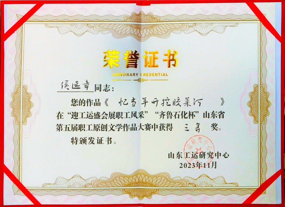 2023年11月,我父親的作品獲得山東工運研究中心(《山東工人報》)征文三等獎。