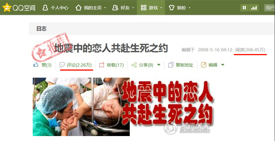 2008年5月16日,騰訊博客發(fā)文《地震中的戀人共赴生死之約》。