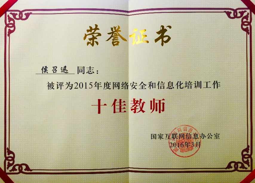 2016年3月,獲中央網(wǎng)信辦頒發(fā)2015年度網(wǎng)絡(luò)安全和信息化培訓(xùn)工作“十佳教師”證書(shū)。
