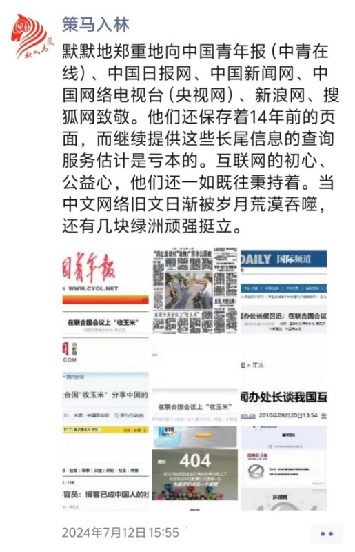 2024年7月3日,我發(fā)了一條朋友圈:前些天看到有人說(shuō)網(wǎng)絡(luò)“崩塌”,有點(diǎn)著慌,馬上去找以前寫(xiě)的一些帖文,真發(fā)現(xiàn)了問(wèn)題。多年前可以搜到數(shù)千上萬(wàn)條自己寫(xiě)的稿子或與己有關(guān)的信息,現(xiàn)在去重、有用的所剩不多,還被一些收費(fèi)網(wǎng)站囤去一些,不交錢(qián)不讓看。QQ空間日志(騰訊博客)的一千多篇還在,互動(dòng)也在,鏈接卻多成死鏈。新浪博客的一千多篇也在,互動(dòng)沒(méi)了,考慮到博主需要,設(shè)置了備份按鈕,確實(shí)負(fù)責(zé)任。早已停服的博客中國(guó),竟然還能打開(kāi)。鏈接的新聞網(wǎng)頁(yè)還在的,有新浪網(wǎng)、中國(guó)青年報(bào)中青在線、中國(guó)日?qǐng)?bào)網(wǎng)、中國(guó)新聞網(wǎng)、央視網(wǎng)、搜狐網(wǎng)等。包括人民網(wǎng)、新華網(wǎng)、中國(guó)網(wǎng)、國(guó)際在線、央廣網(wǎng)等大多數(shù)新聞網(wǎng)站及騰訊新聞、網(wǎng)易新聞、鳳凰新聞等,已經(jīng)404或403,而我最多的鏈接是人民網(wǎng)的,真是遺憾。對(duì)低效益的冷寂長(zhǎng)尾內(nèi)容,很多網(wǎng)站平臺(tái)不愿再運(yùn)營(yíng)維護(hù),便卸載斷服?!盎ヂ?lián)網(wǎng)是有記憶的”,這話需要加以限定了,十年記憶就不容易,“永久”“免費(fèi)”已是傳說(shuō)。接下來(lái),有用的盡快備份吧,不管微博微信短視頻啥的,來(lái)有影去無(wú)蹤,或終將煙消云散南柯夢(mèng)。值得敬佩的是一些良心平臺(tái),尚能以公益為重,秉持初心,堅(jiān)持至今,繼續(xù)提供信息服務(wù),不容易不簡(jiǎn)單。
