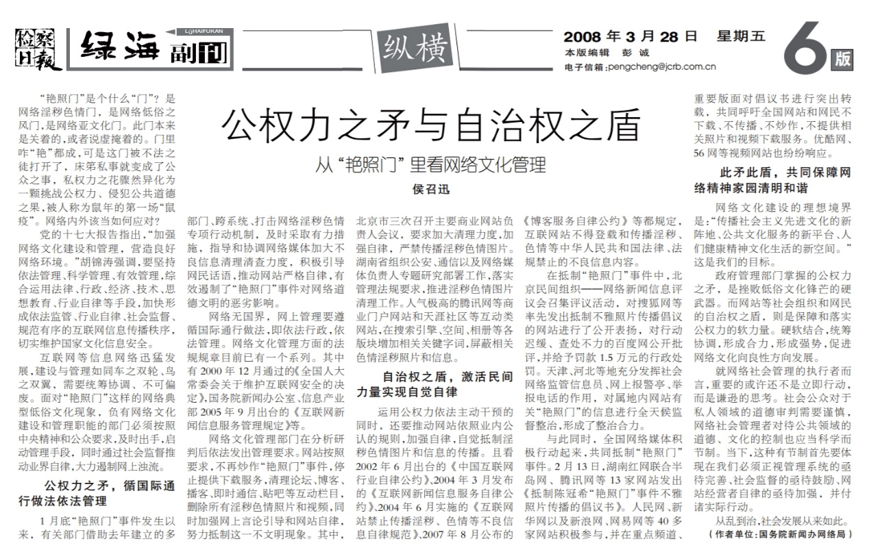 針對(duì)“艷照門(mén)”等網(wǎng)絡(luò)低俗文化現(xiàn)象的治理,撰寫(xiě)《公權(quán)力之矛與自治權(quán)之盾——從“艷照門(mén)”里看網(wǎng)絡(luò)文化管理》,刊于2008年3月28日《檢察日?qǐng)?bào)》。文章提出,負(fù)有網(wǎng)絡(luò)文化建設(shè)和管理職能的部門(mén)要遵循國(guó)際通行做法,依法行政,依法管理,及時(shí)出手,啟動(dòng)管理手段。運(yùn)用公權(quán)力依法主動(dòng)干預(yù)的同時(shí),還要推動(dòng)網(wǎng)站依照業(yè)內(nèi)公認(rèn)的規(guī)則,加強(qiáng)自律,自覺(jué)抵制淫穢色情圖片和信息的傳播。政府管理部門(mén)掌握的公權(quán)力之矛,是挫敗低俗文化鋒芒的硬武器。而網(wǎng)站等社會(huì)組織和網(wǎng)民的自治權(quán)之盾,則是保障和落實(shí)公權(quán)力的軟力量。硬軟結(jié)合,統(tǒng)籌協(xié)調(diào),形成合力,促進(jìn)網(wǎng)絡(luò)文化良性發(fā)展。就網(wǎng)絡(luò)社會(huì)管理的執(zhí)行者而言,非常重要的一點(diǎn)是謙遜的思考。社會(huì)公眾對(duì)于私人領(lǐng)域的道德審判需要謹(jǐn)慎,網(wǎng)絡(luò)社會(huì)管理者對(duì)待公共領(lǐng)域的管控也應(yīng)當(dāng)科學(xué)而節(jié)制。當(dāng)下,管理系統(tǒng)亟待完善,社會(huì)監(jiān)督亟待鼓勵(lì),網(wǎng)站經(jīng)營(yíng)者自律亟待加強(qiáng)。