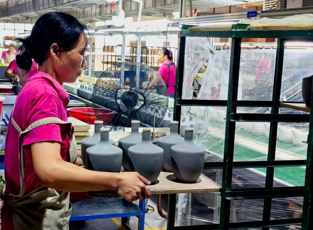 湖南銀和瓷業(yè)有限公司車(chē)間工人在生產(chǎn)酒瓶(7月27日攝)。新華社記者 蘇曉洲 攝