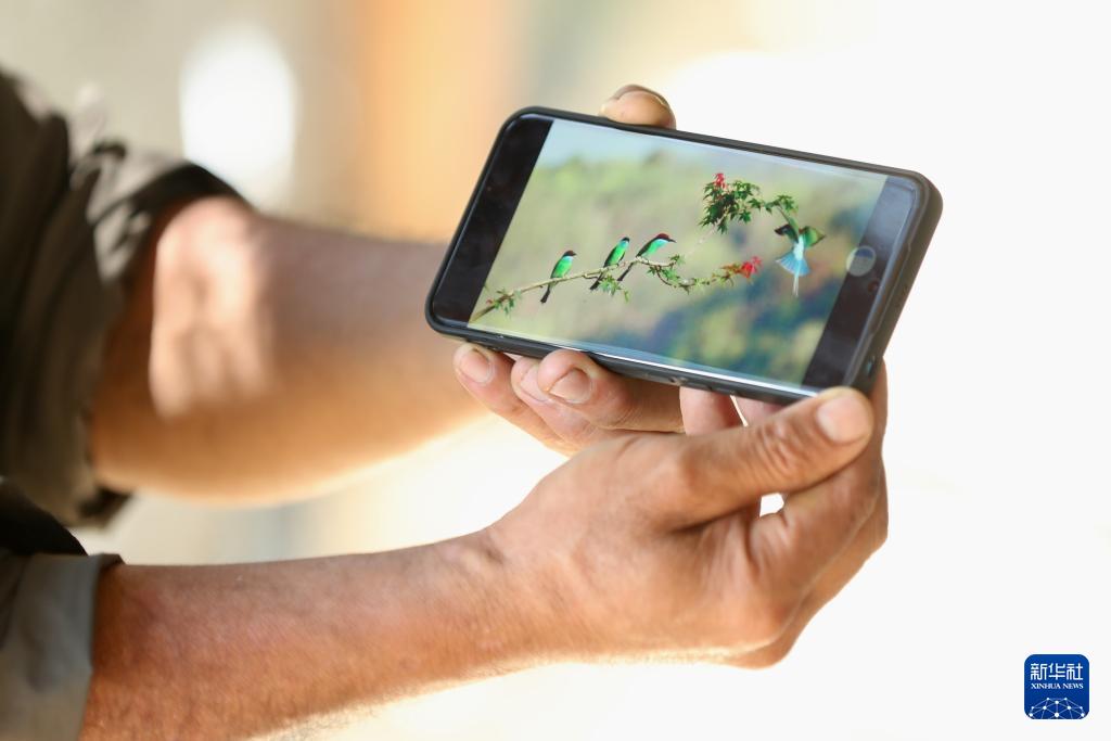 8月12日,福建南平市延平區(qū)爐下鎮(zhèn)斜溪村村民王崇年展示手機里攝影愛好者發(fā)來的藍喉蜂虎照片。 新華社記者 姜克紅 攝