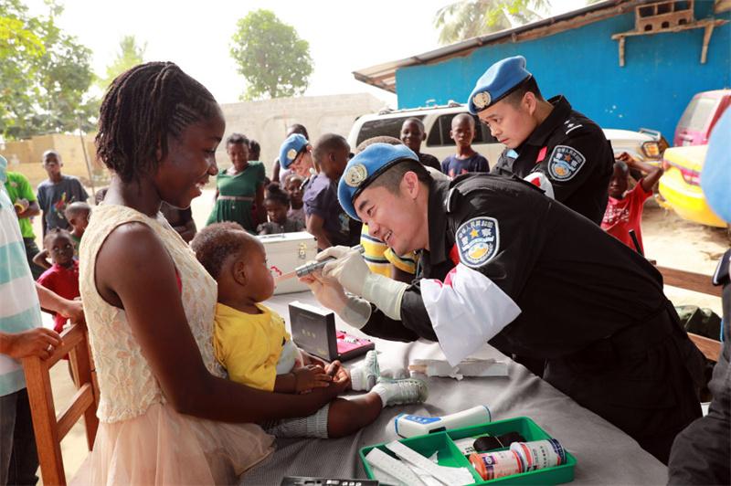 2017年12月28日,在利比里亞蒙羅維亞,中國(guó)維和警察防暴隊(duì)醫(yī)療人員為兒童做口腔檢查。
