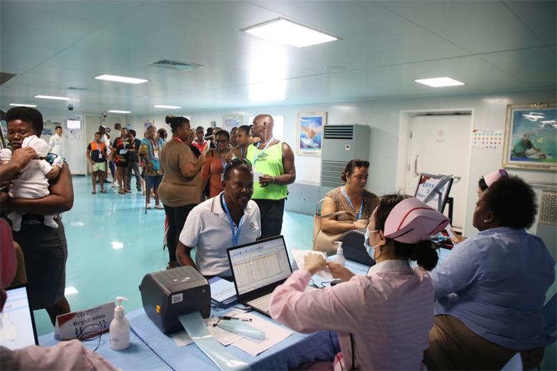 2024年7月8日,塞舌爾民眾在中國(guó)海軍“和平方舟”號(hào)醫(yī)院船上排隊(duì)就診。