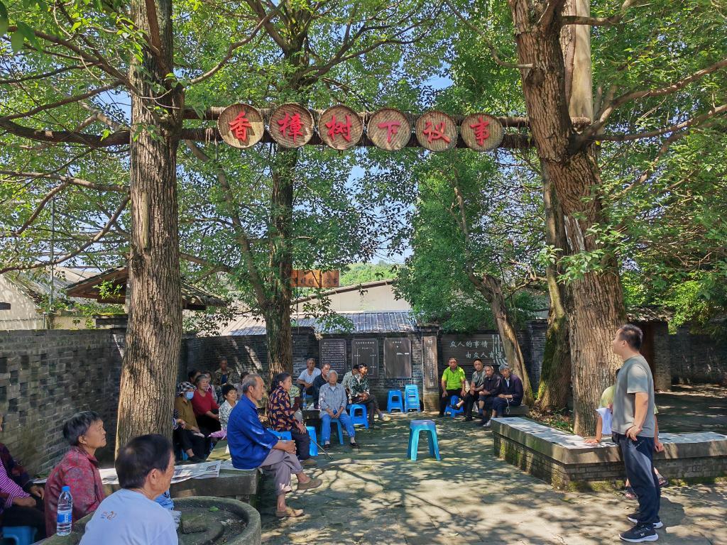 重慶市南川區(qū)木涼鎮(zhèn)漢場(chǎng)壩村的村民們?cè)谙阏翗湎埋雎犉辗ü适?。新華社記者周思宇 攝