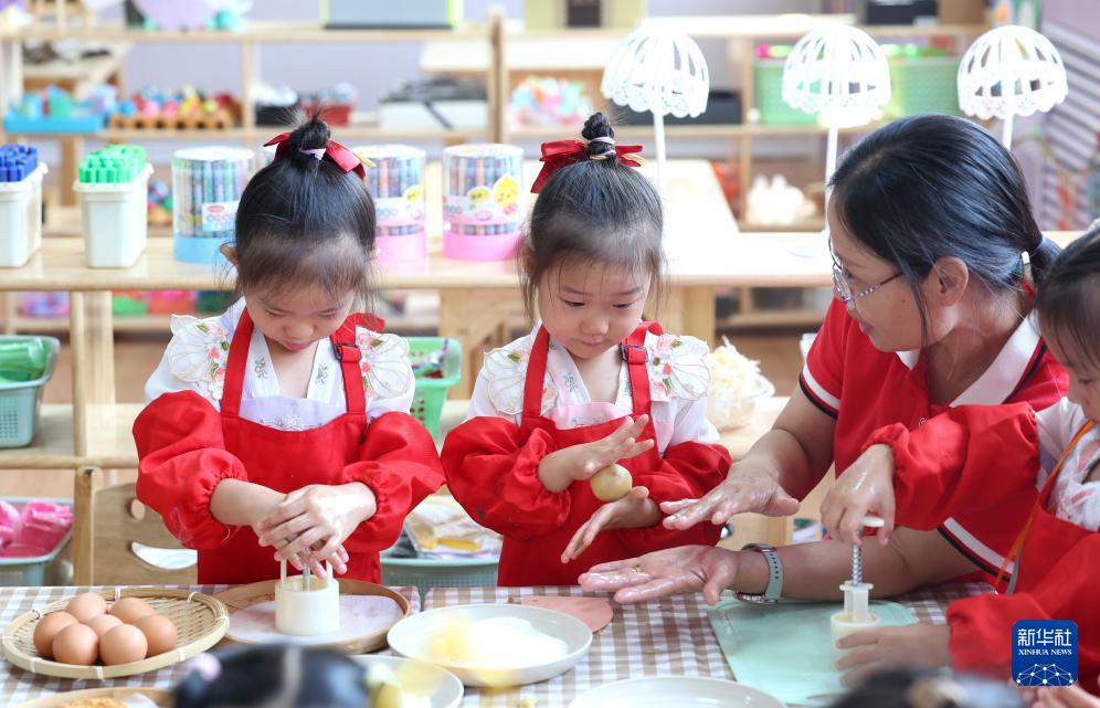 9月4日,在河北省石家莊市藁城區(qū)通安幼兒園,小朋友在老師的指導(dǎo)下學(xué)做手工月餅。