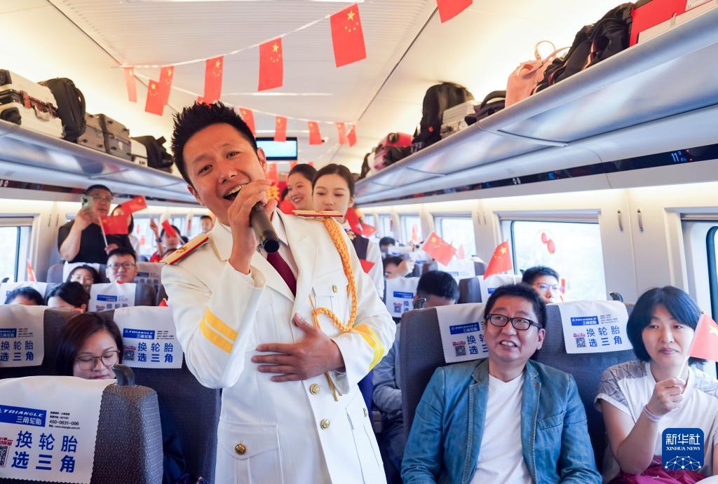 9月28日,在上海虹橋開往北京南的G10次高鐵列車上,工作人員在“乘高鐵 迎國(guó)慶”主題活動(dòng)中演唱《我和我的祖國(guó)》。