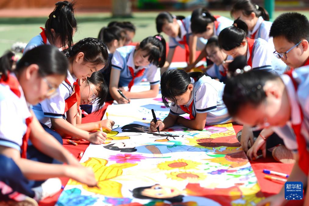 9月28日,在山東青島重慶路第三小學(xué),孩子們共繪迎佳節(jié)彩色畫卷。