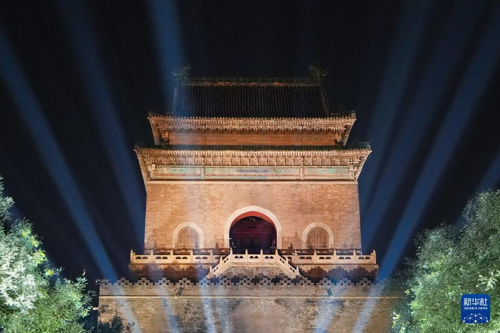 9月26日拍攝的完成景觀照明設(shè)施提升后亮燈的鼓樓和鐘樓。