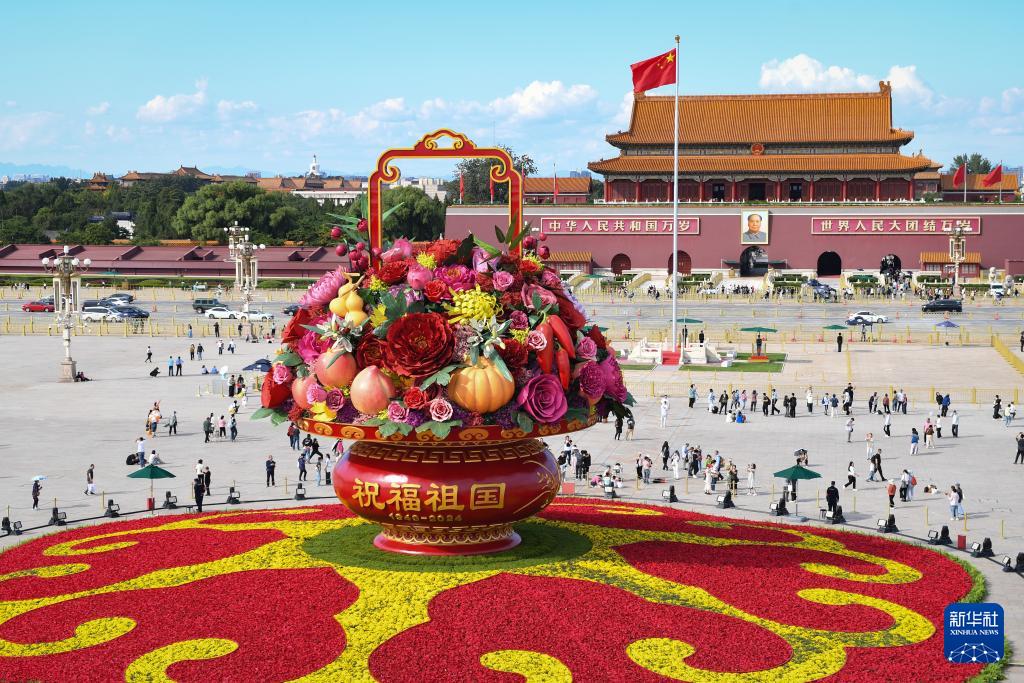 9月25日拍攝的天安門廣場(chǎng)“祝福祖國”巨型花籃。