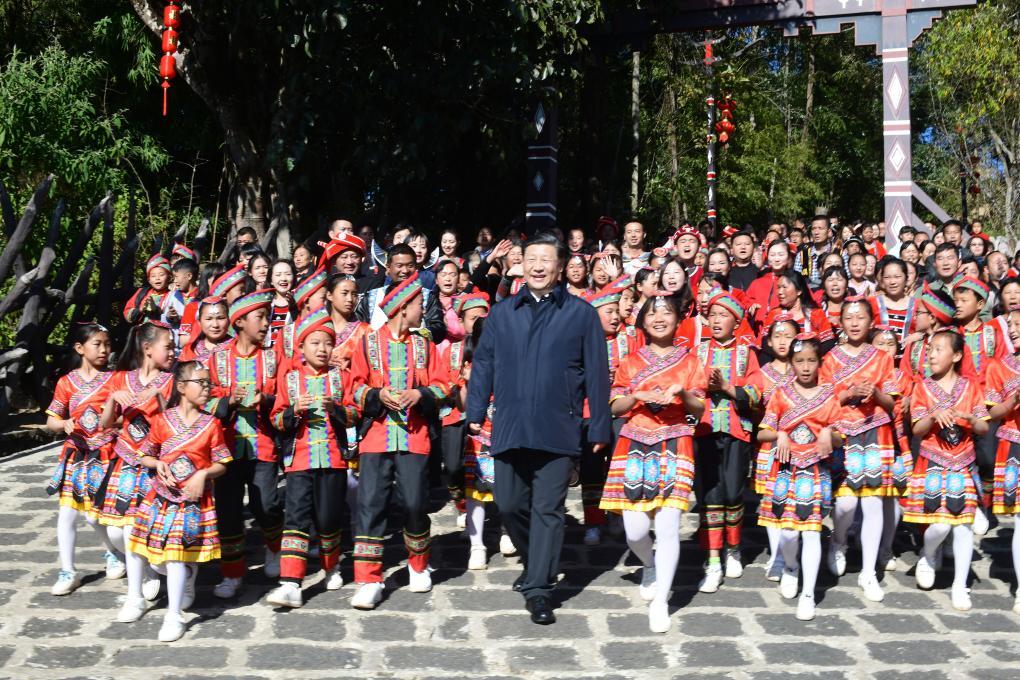 2020年1月19日至21日,習(xí)近平總書記來到云南,看望慰問各族干部群眾,向全國人民致以新春祝福。這是19日下午,騰沖市清水鄉(xiāng)三家村中寨司莫拉佤族村的鄉(xiāng)親們唱著《阿佤人民唱新歌》,簇擁著習(xí)近平總書記走出村口。新華社記者 謝環(huán)馳 攝