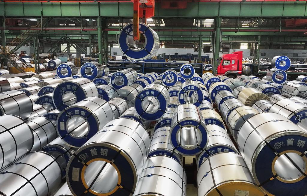 首鋼京唐公司成品車間的吊裝設(shè)備在吊運(yùn)鋼板(無人機(jī)照片)。新華社記者 楊世堯 攝