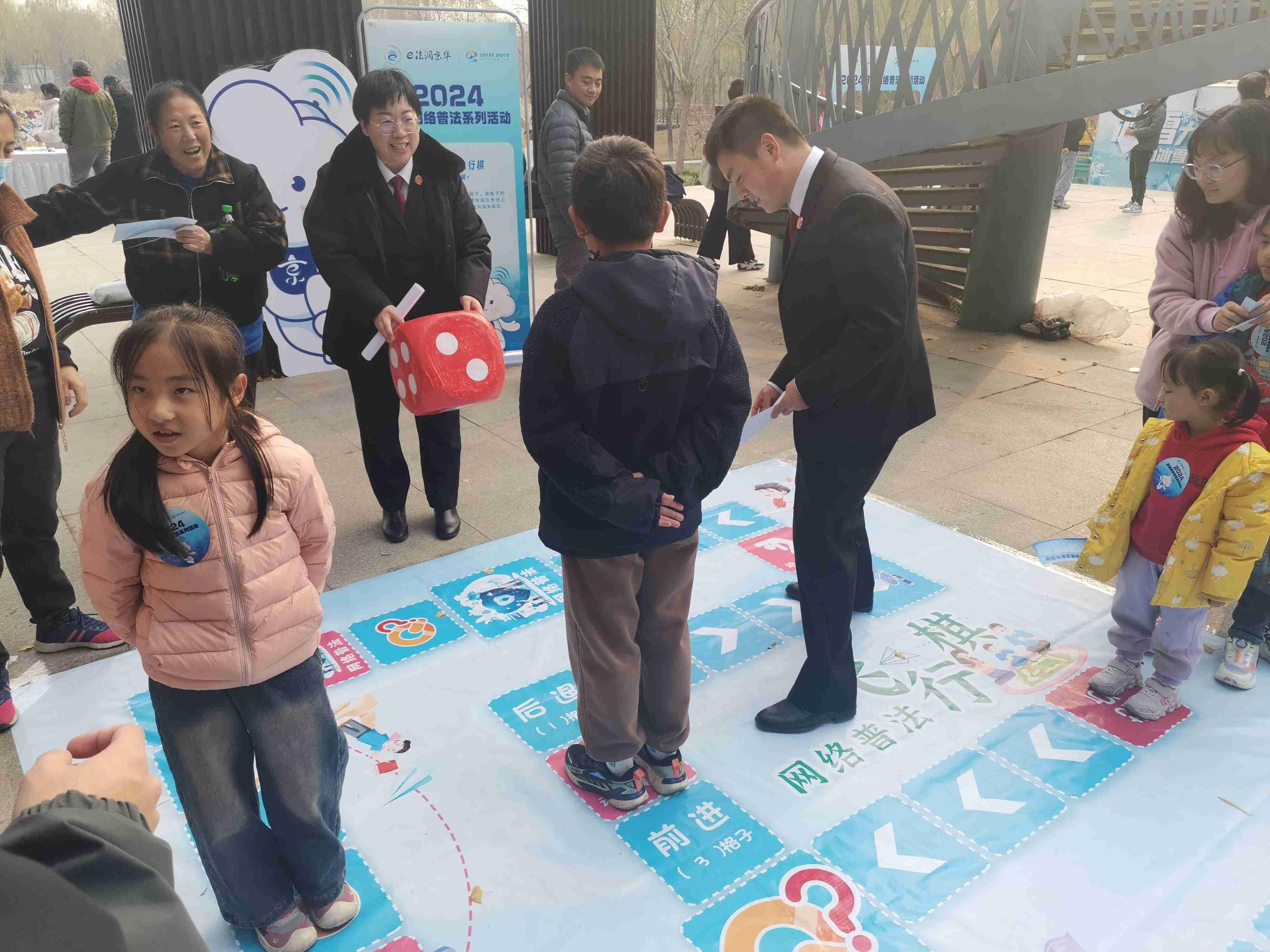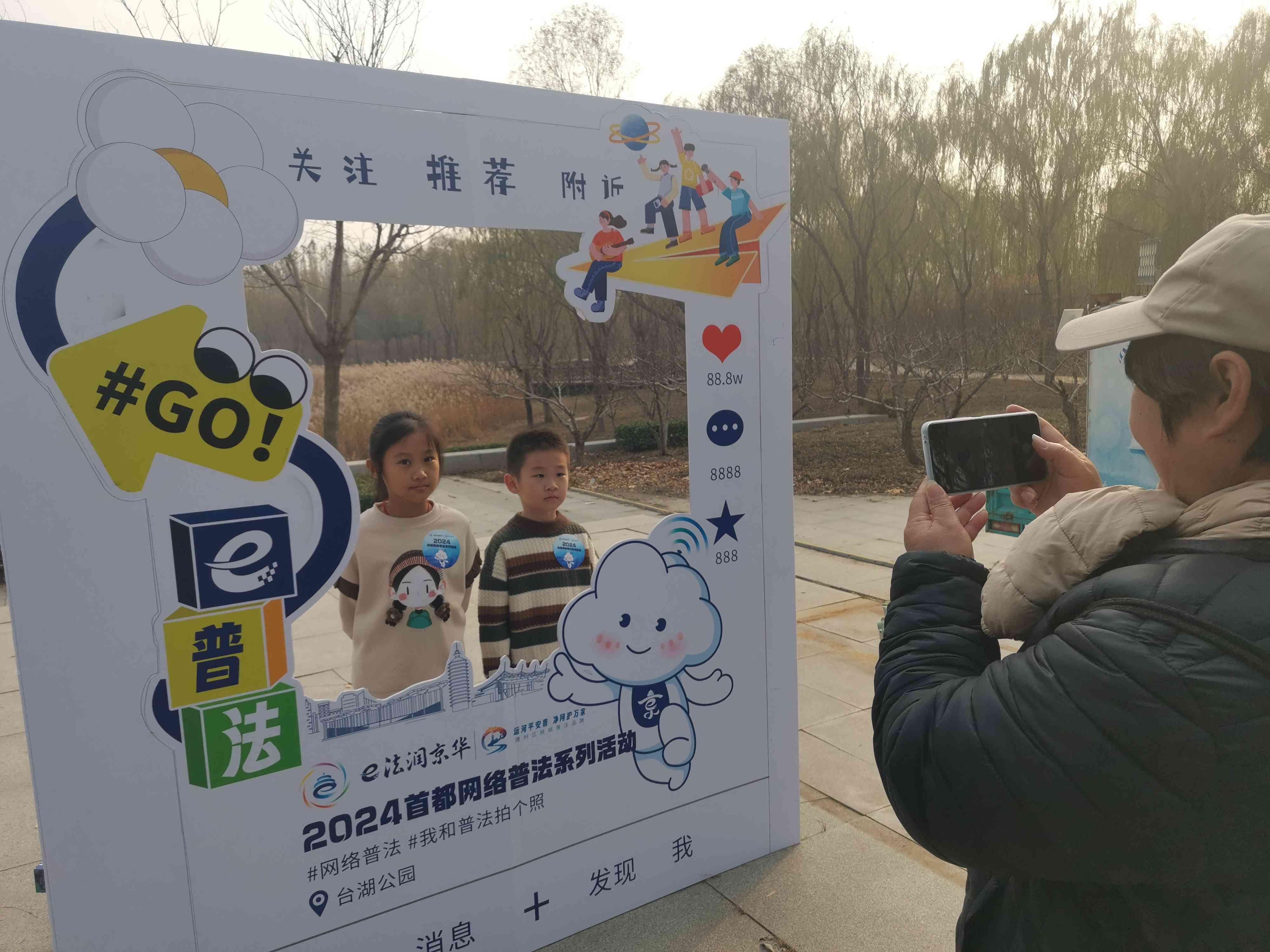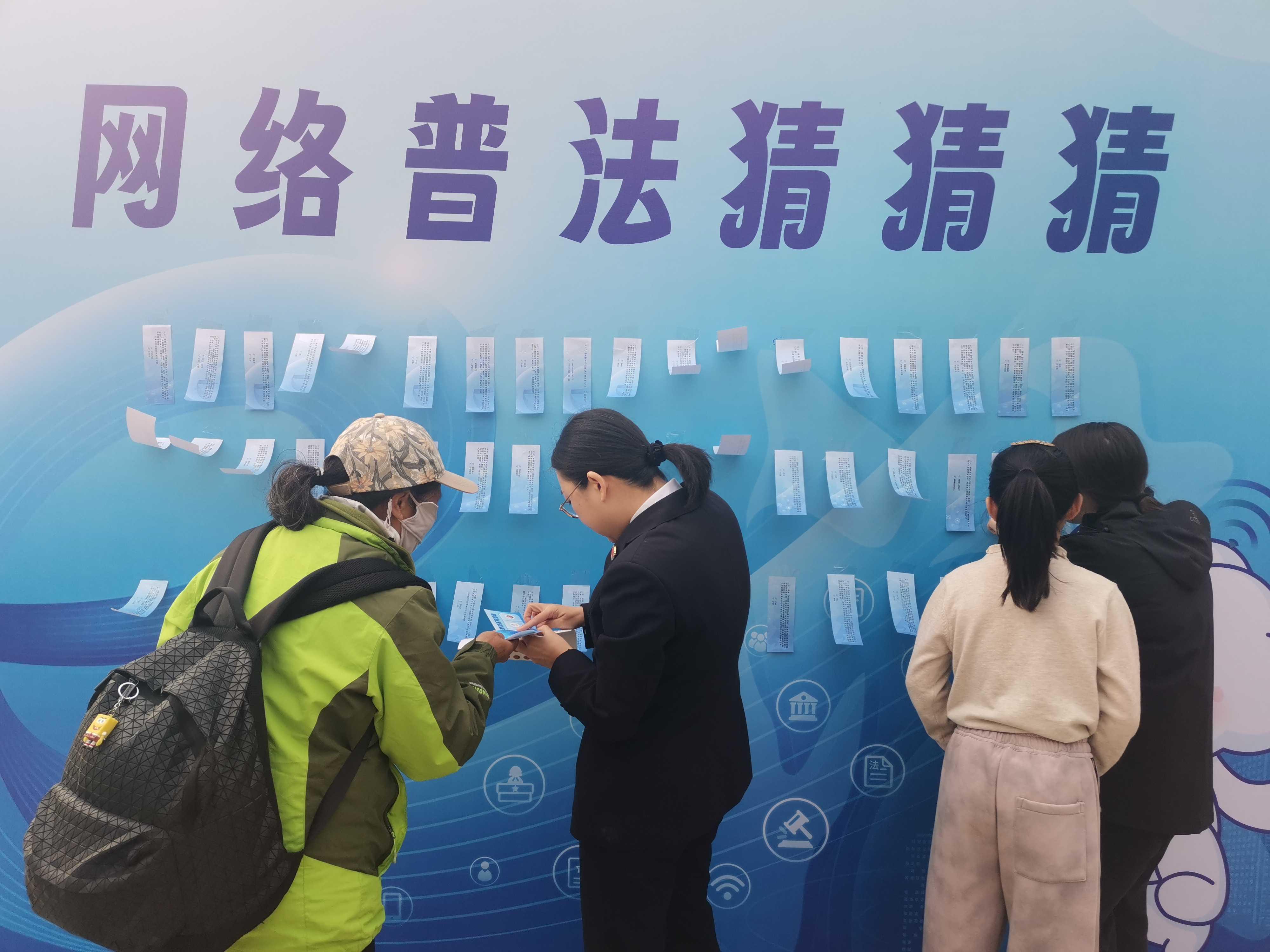 猜謎語(yǔ)、繪圖畫、拼拼圖、玩游戲……11月9日下午,北京市通州區(qū)臺(tái)湖公園內(nèi)人聲鼎沸、熱鬧非凡,由北京市委網(wǎng)信辦主辦,通州區(qū)委網(wǎng)信辦承辦,通州區(qū)人民法院、通州區(qū)人民檢察院、通州區(qū)教委以及臺(tái)湖鎮(zhèn)人民政府協(xié)辦的“e法潤(rùn)京華·運(yùn)河平安獸 護(hù)網(wǎng)凈萬(wàn)家”網(wǎng)絡(luò)普法游園會(huì)正如火如荼地進(jìn)行。記者在現(xiàn)場(chǎng)看到,人們駐足觀看普法短劇并爭(zhēng)相和劇中的小主人公合影、在普法展板前聽(tīng)檢察官以案講法、在網(wǎng)絡(luò)普法像框墻前打卡留念,在手繪布上畫下對(duì)網(wǎng)絡(luò)安全和文明上網(wǎng)的理解與期盼。而現(xiàn)場(chǎng)設(shè)置的網(wǎng)絡(luò)普法猜猜猜、普法拼圖大挑戰(zhàn)、網(wǎng)絡(luò)普法飛行棋等闖關(guān)游戲更是引起眾多小朋友的興趣和熱情,每個(gè)游戲區(qū)前都排起了長(zhǎng)隊(duì),在歡聲笑語(yǔ)中,針對(duì)未成年人的網(wǎng)絡(luò)保護(hù)知識(shí)也在孩子們心中扎根發(fā)芽。