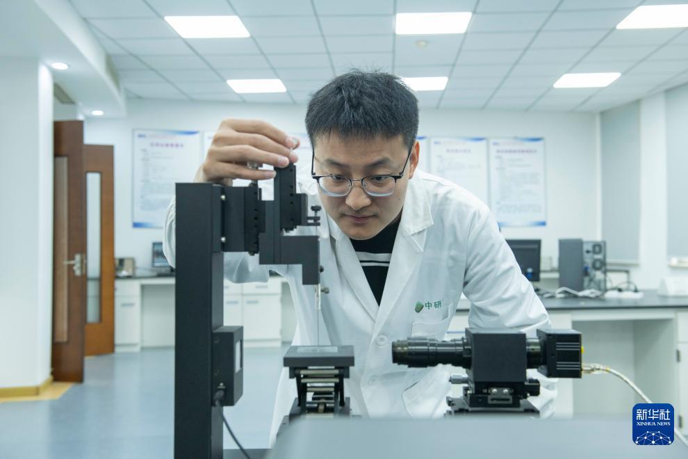 研究人員在浮法玻璃新技術(shù)國家重點實驗室利用接觸角測量儀檢測鍍膜玻璃親疏水性(11月8日攝)。