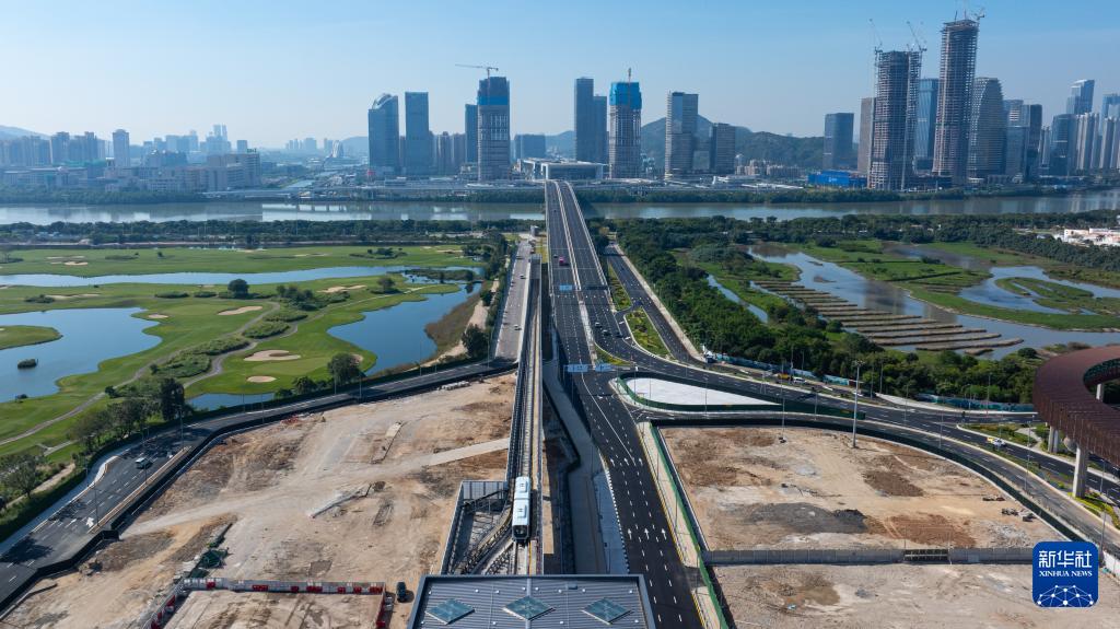 ??12月2日,澳門輕軌從蓮花站開(kāi)往橫琴站(無(wú)人機(jī)照片)。新華社發(fā)(張金加攝)