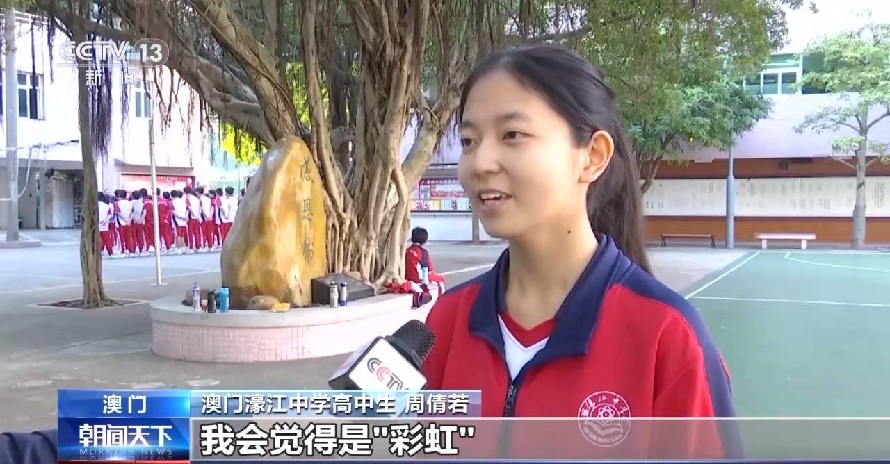 澳門濠江中學(xué)高中生 周倩若:我會(huì)覺(jué)得是“彩虹”,因?yàn)椴屎缡怯泻芏囝伾?,這種七彩的顏色,也代表了多彩的未來(lái)。澳門回歸祖國(guó)25周年,我希望也許在下一個(gè)25周年的時(shí)候,這7個(gè)顏色的彩虹,每一條顏色由我們這一代人給它填上顏色,不管是在科技領(lǐng)域還是在體育方面,在各行各業(yè)都有我們這一代人的身影。我覺(jué)得當(dāng)我們成長(zhǎng)為可以由我們來(lái)書寫澳門的七彩彩虹的時(shí)候,相信澳門一定是發(fā)展得更好。