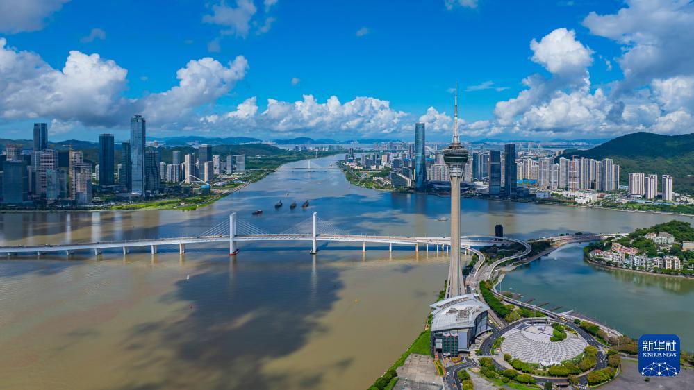 這是7月8日拍攝的澳門半島、橫琴及珠海景色(無人機照片)。新華社發(fā)(張金加 攝)