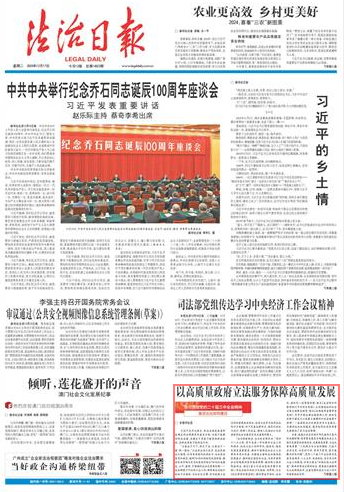 當(dāng)前,我國正處在實(shí)現(xiàn)中華民族偉大復(fù)興的關(guān)鍵時(shí)期,高質(zhì)量發(fā)展是全面建設(shè)社會主義現(xiàn)代化國家的首要任務(wù)。發(fā)展要高質(zhì)量,立法也要高質(zhì)量,“人民群眾對立法的期盼,已經(jīng)不是有沒有,而是好不好、管用不管用、能不能解決實(shí)際問題”。黨的二十屆三中全會要求完善黨委領(lǐng)導(dǎo)、人大主導(dǎo)、政府依托、各方參與的立法工作格局,并首次提出“加強(qiáng)政府立法審查”。新的形勢決定新的任務(wù),需要我們持續(xù)深化立法領(lǐng)域改革,注重發(fā)揮政府在立法工作中的重要依托作用,加強(qiáng)和改進(jìn)政府立法制度建設(shè),不斷提高政府立法質(zhì)效,以高質(zhì)量政府立法服務(wù)保障高質(zhì)量發(fā)展。