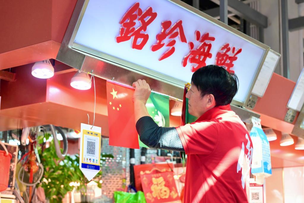 澳門紅街市的一家魚檔業(yè)主關偉銘在檔位上掛起嶄新的國旗區(qū)旗,還特意穿上喜慶的衣服?!傲曋飨牡肽?,讓澳門人都非常感激。我寫了一副對聯(lián):‘盛世龍傳鏡海興,街市當紅百業(yè)旺’,想告訴習主席,我們的日子越來越紅火?!彼f。