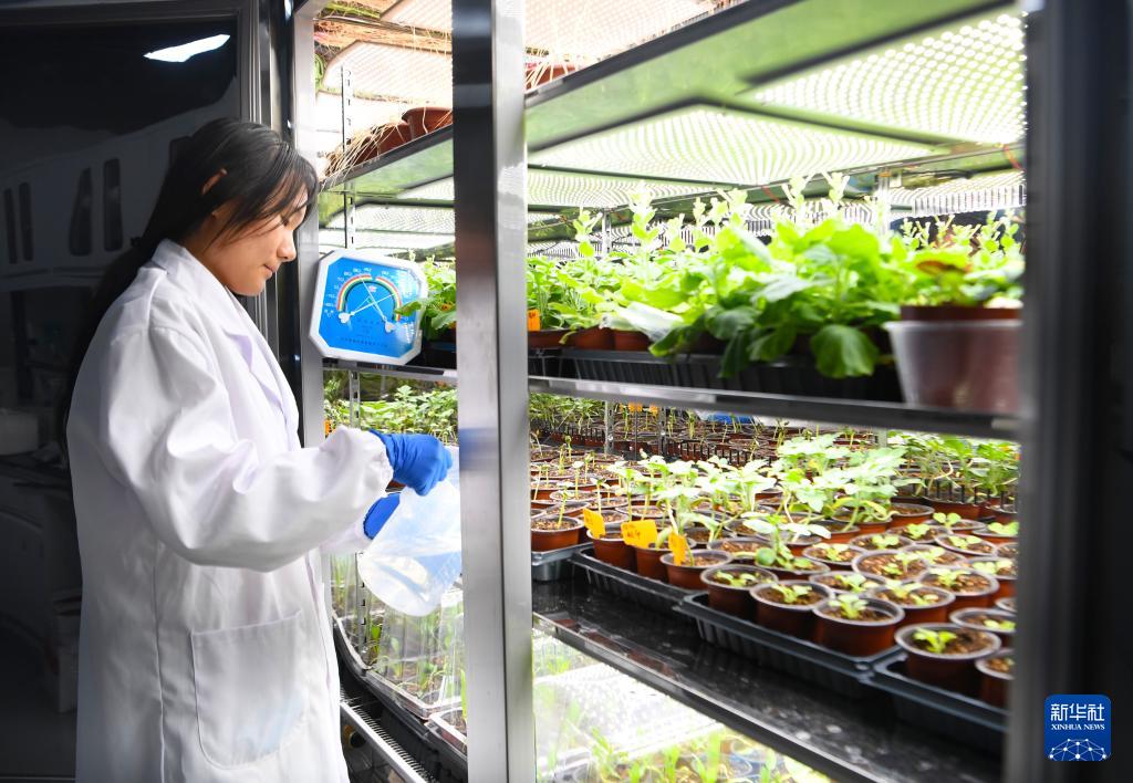12月25日,在位于河南新鄉(xiāng)的中原農(nóng)谷實(shí)驗(yàn)室,中國(guó)農(nóng)科院中原研究中心科研人員給植物光照培養(yǎng)箱內(nèi)的樣本澆水。