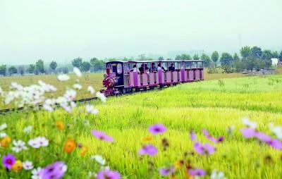 在河南汝陽縣三屯鎮(zhèn)東保村“稻田小鎮(zhèn)”,游客乘坐小火車在稻田旅游觀光。新華社發(fā)