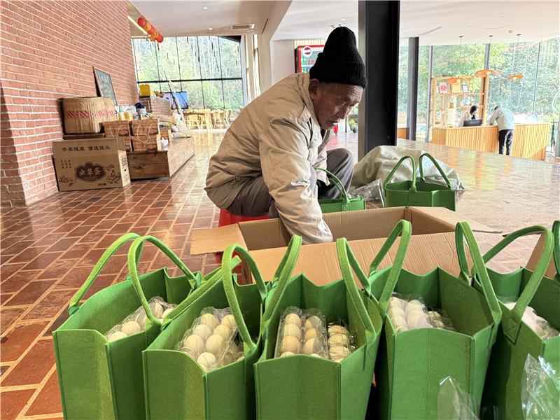 2023年,海洋村嘗試“農(nóng)業(yè)+民宿”,將村里的養(yǎng)殖的土豬、土雞制作成半成品,包裝成禮盒售賣,“去年剛開始只銷售了二十多萬元。今年的銷售情況很好,從2024年底到現(xiàn)在,已經(jīng)售賣了六十多萬元。” 馮源淵笑容滿滿,“進入臘月后,已經(jīng)宰殺了二十多頭黑豬,還有致電想要預定的都沒有了。”