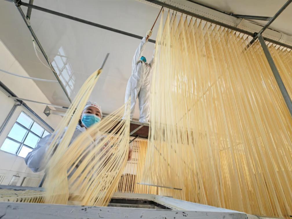 1月16日,在古浪縣泗水鎮(zhèn)的一家手工掛面生產(chǎn)車(chē)間,工人在制作掛面。新華社記者 王朋 攝