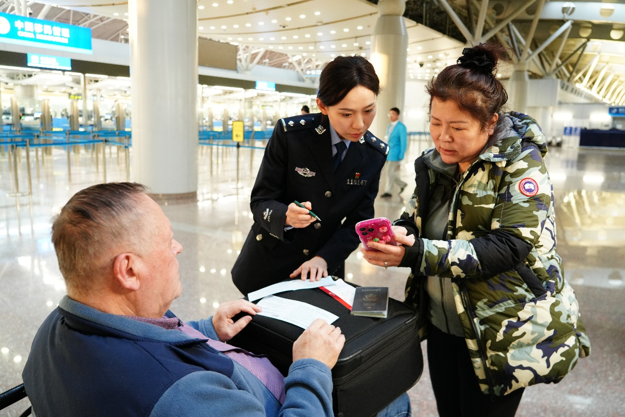 來自北京邊檢總站執(zhí)勤六大隊(duì)的杜希銘,早早站在“特別通道”前等待旅客們的到來。“特別通道”是專門為老人、兒童、殘障人士等設(shè)置,方便他們更快捷地通過??吹揭患胰送浦鴥和囎叩饺刖硻z查點(diǎn),杜希銘連忙走上前去,微笑著指引著他們走“特別通道”通過。