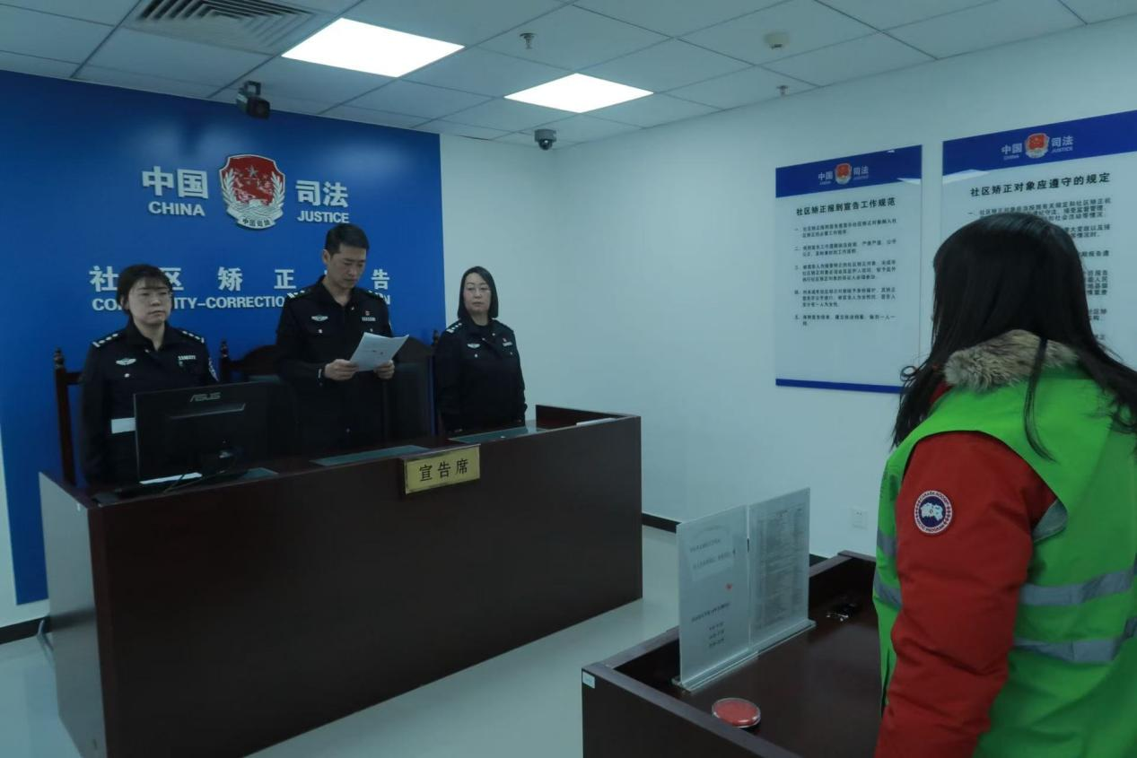 比起心理咨詢室里的溫情,在另外一間“宣告室”內(nèi),氣氛則明顯莊嚴。中午十二點十分,選派監(jiān)獄(戒毒)警察參與社區(qū)矯正工作的趙奎向入矯對象嚴肅地宣讀相關規(guī)定:“在社區(qū)矯正期間應當遵守法律法規(guī),服從監(jiān)管,接受教育……”這是入矯對象在社區(qū)矯正中心的最后一個環(huán)節(jié)。