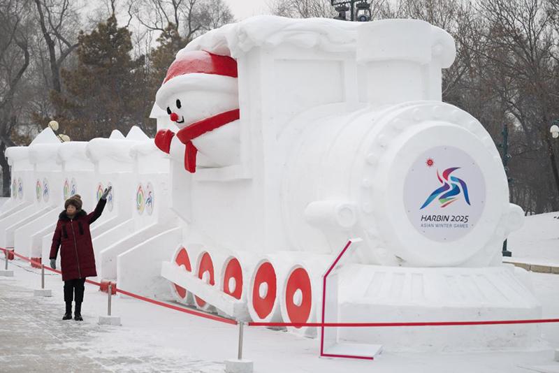 1月7日,在哈爾濱太陽島雪博會園區(qū),游客與“亞冬列車”雪雕合影。新華社記者 張濤 攝