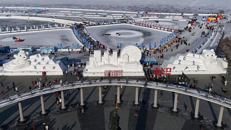 這是1月8日在哈爾濱道里區(qū)的防洪紀念塔廣場拍攝的亞冬會吉祥物雪雕“濱濱”和“妮妮”(無人機照片)。新華社記者 王松 攝