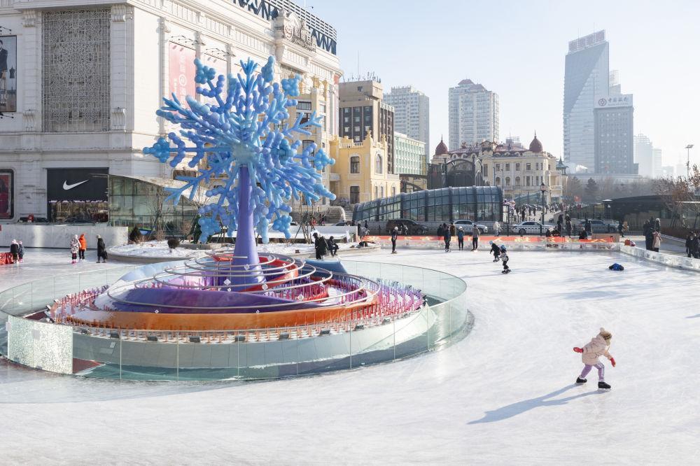 1月4日,在哈爾濱市南崗區(qū)一處公益冰場(chǎng),人們?cè)凇氨┲凇钡袼芘曰P氯A社記者 謝劍飛 攝