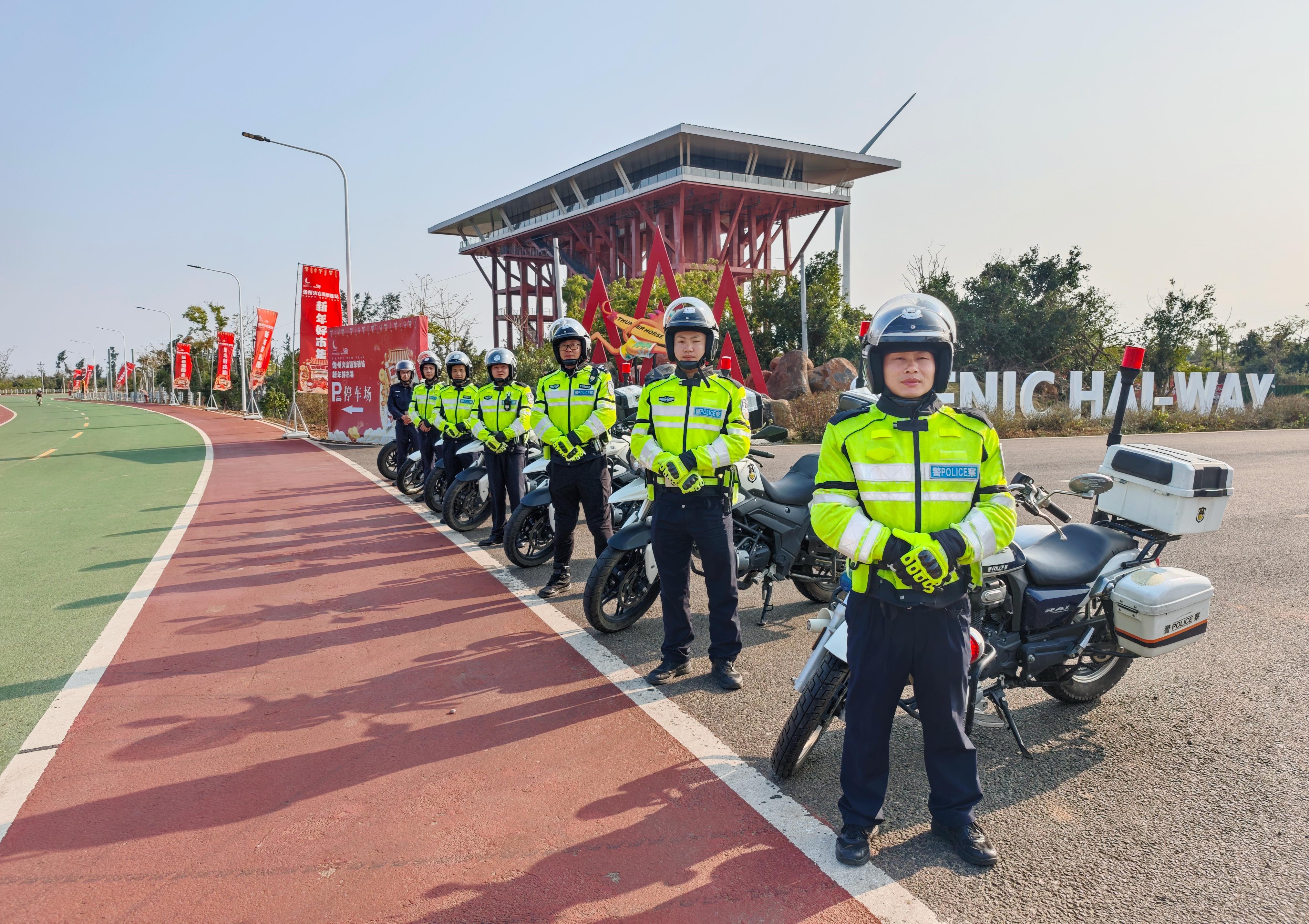 省公安廳反走私和管理總隊第七支隊警用摩托車隊員在旅游景點有序疏導(dǎo)交通