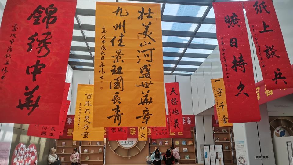 魏縣圖書館的四季童書閱覽區(qū)內懸掛著書法條幅。魏縣縣委宣傳部供圖(王德峰 攝)
