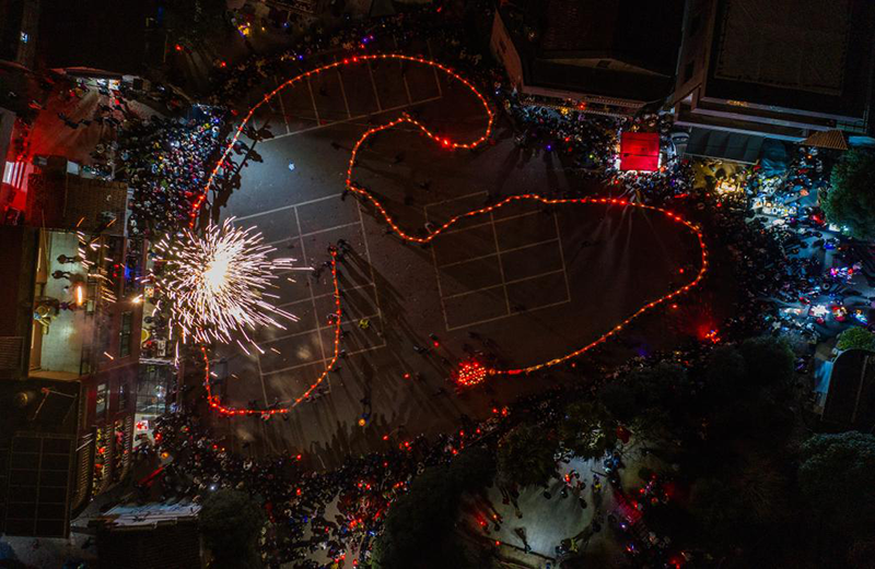 2月10日,赤松鎮(zhèn)虎巖村村民抬著板凳龍,開(kāi)始進(jìn)行晚上的巡游(無(wú)人機(jī)照片)。新華社記者徐昱 攝