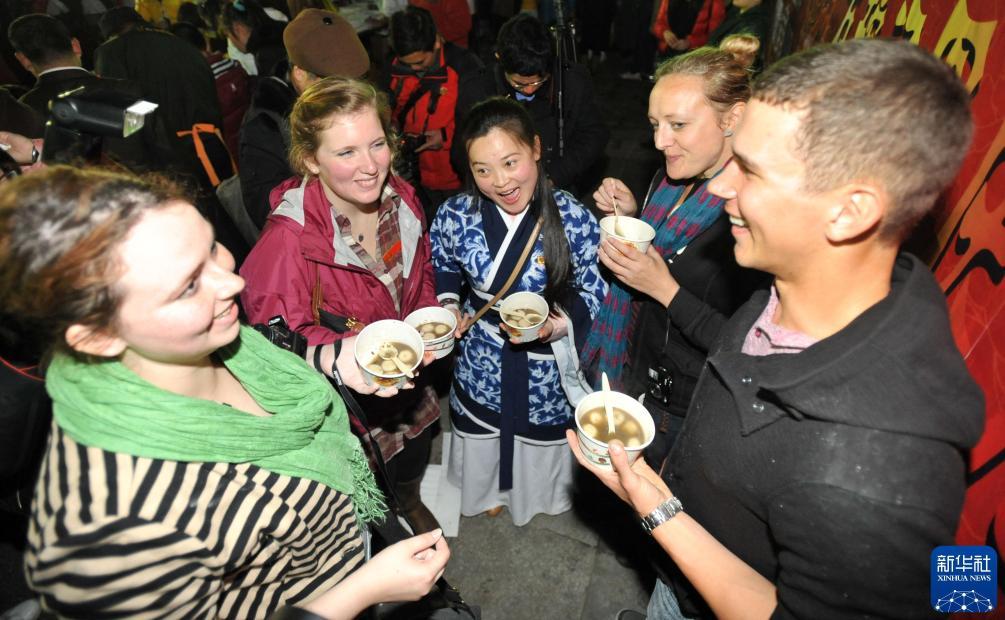 2013年2月24日,在廣西桂林陽(yáng)朔西街,幾名外國(guó)游客品嘗湯圓。新華社記者 陸波岸 攝
