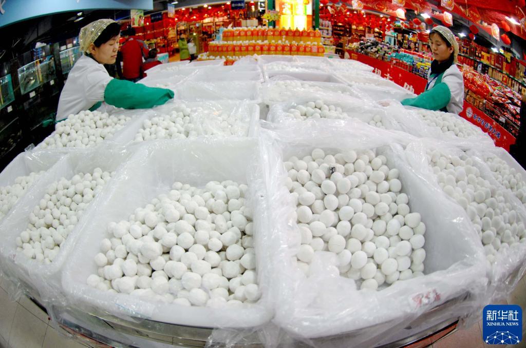 2011年2月11日,寧夏銀川某大型超市的工作人員在擺放元宵。新華社記者 彭昭之 攝