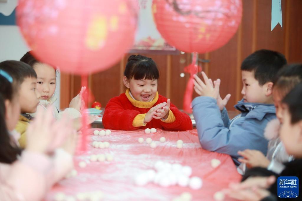 2021年2月24日,在江蘇省揚(yáng)州市杉灣花園社區(qū),小朋友動(dòng)手包湯圓。新華社發(fā)(孟德龍 攝)