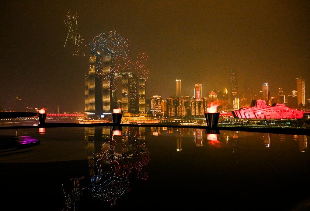 圖為在重慶拍攝的無人機表演。春節(jié)期間,多場無人機表演在重慶朝天門長江、嘉陵江兩江交匯處精彩上演。新華社記者 王全超 攝