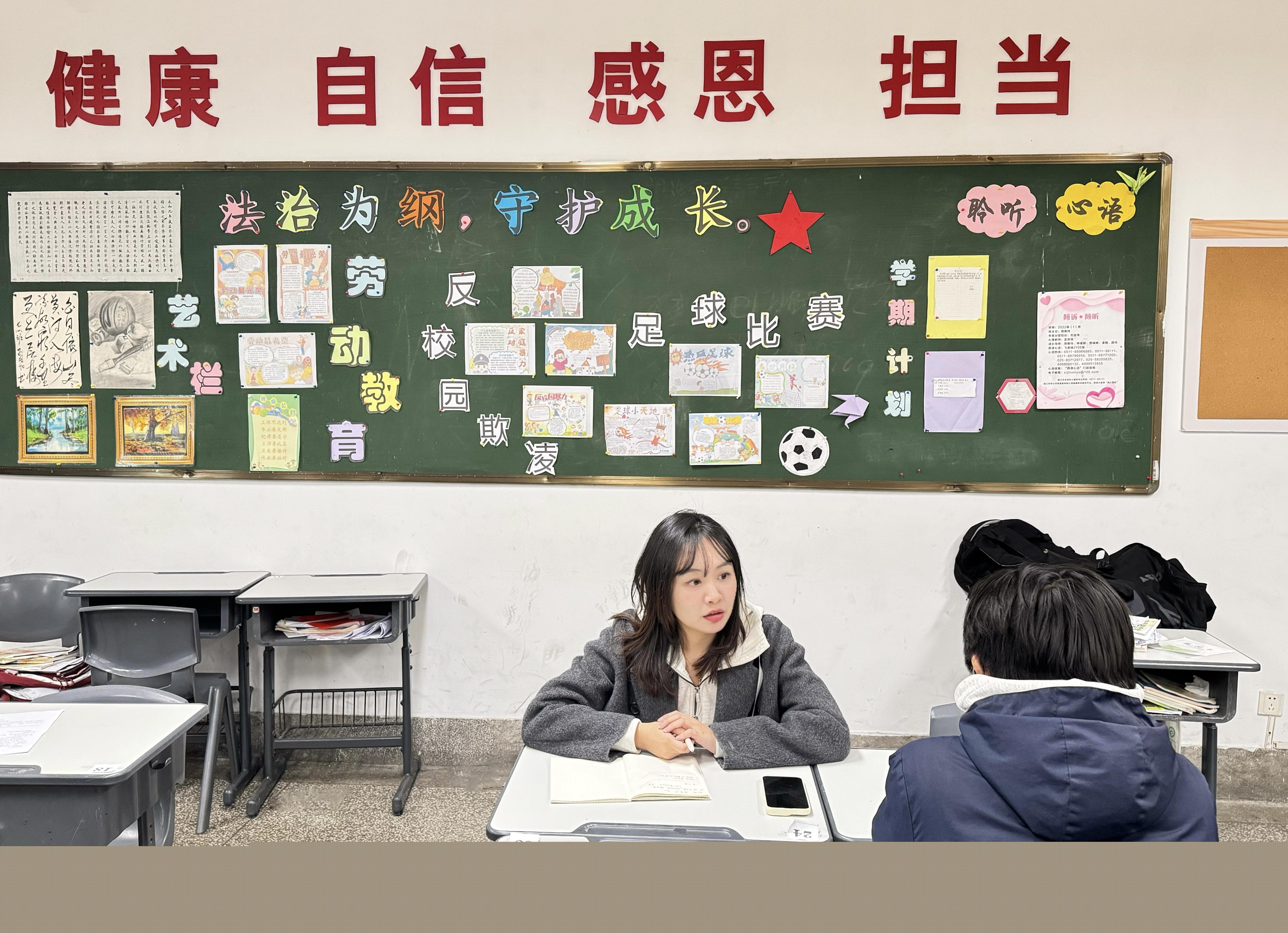 在每間教室里,都有“拒絕校園欺凌”主題黑板報(bào),包含應(yīng)對(duì)方法和孩子們親手繪制的漫畫(huà)。黑板報(bào)旁邊的公告欄,還貼滿(mǎn)了德育處、教務(wù)處老師以及心理教師、成長(zhǎng)導(dǎo)師等校園緊急聯(lián)系人聯(lián)系方式。