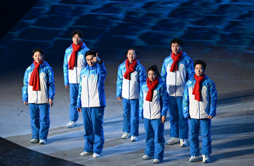 舞臺上,當現(xiàn)場舞者與虛擬樂團交相呼應(yīng),閉幕式演出震撼開場。身穿橘黃紗裙的舞者翩然,宛如冰凌花朵朵綻放??蓯鄣摹把┤恕蔽鑴尤珗觯路鹧┥降木`帶來捷報。