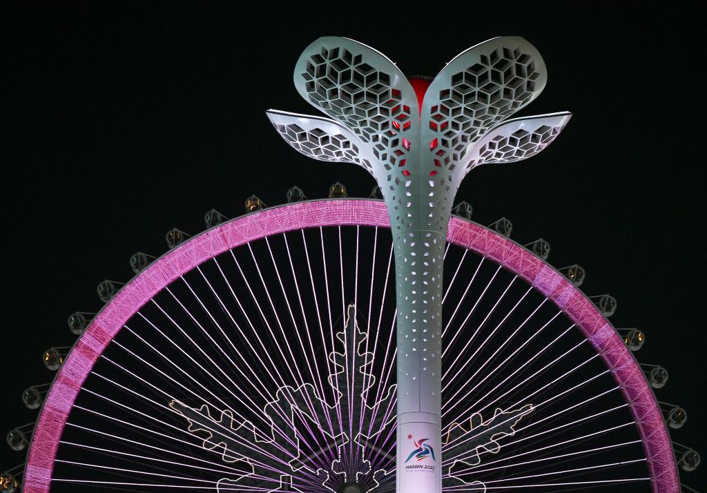 當喧囂的賽場漸漸沉寂,當忙碌的身影停下腳步,開幕式上的巨型冰燈返場,鏡頭來到分會場。夜空之下,冰雪大世界里,雪花摩天輪前,亞冬圣火緩緩熄滅,絢麗燈光灼灼其華。