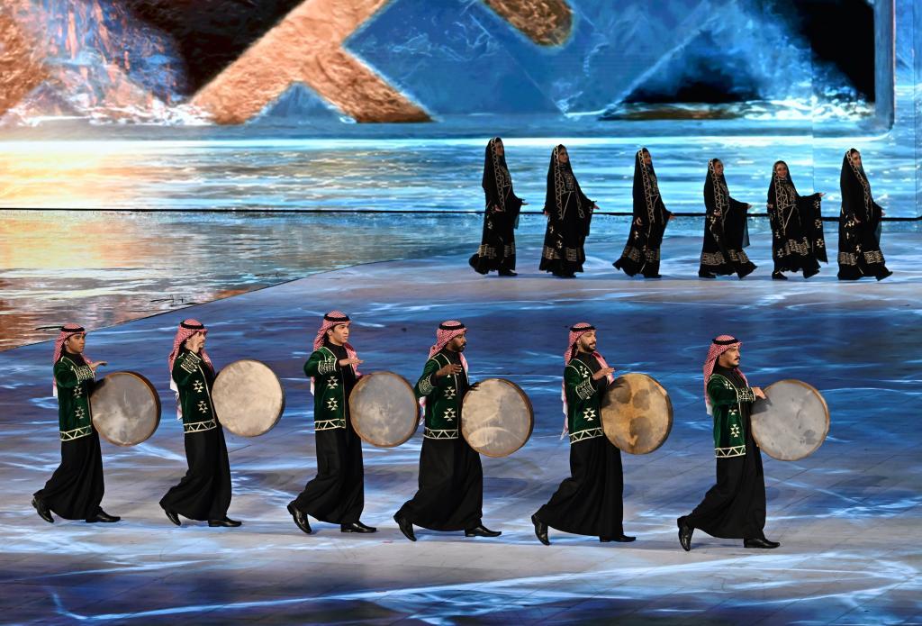 作為下一屆亞冬會舉辦城市,來自沙特阿拉伯未來新城的文藝表演舞姿曼妙,鼓點歡快,洋溢著濃郁的西亞風情。頃刻間,整個舞臺化作冰雪運動場,光影穿梭的運動員號召著下一次相約,在現(xiàn)場掀起新的高潮。